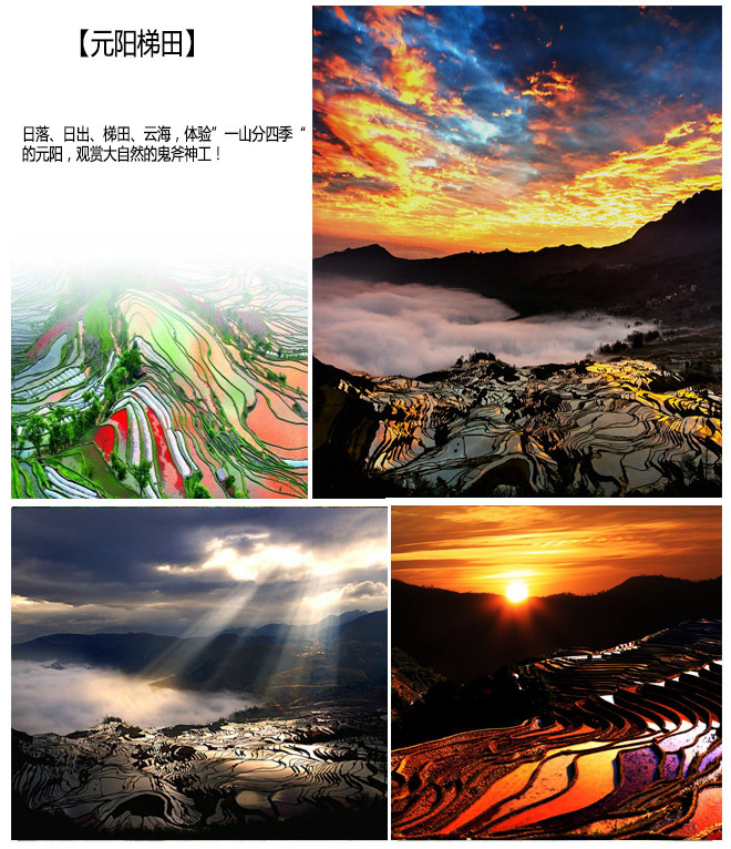 特别提示:1、元阳属哈尼族集聚地,请尊重当地民族礼仪和风俗习惯。、今日需要早起看日出(约5:30左右),请大家头天晚上早点休息!老虎嘴景区的日落观赏最佳时间是18:30分左右,请您自备一些充饥食品。